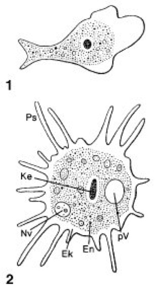 1 Limax-Amöbe (Vahlkampfia),2 Fingeramöbe (Dactylosphaerium). Ek Ektoplasma, En Endoplasma, Ke Kern, Nv Nahrungsvakuole, Ps Pseudopodium, pV pulsierende Vakuole
