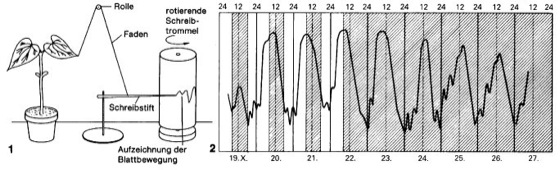 1 Vorrichtung zur Registrierung der nyktinastischen Bewegungen von Bohnenblättern. Einer Hebung des Blatts entspricht eine Senkung des Kurvenzugs auf der Schreibtrommel, einer Senkung des Blatts eine Hebung des Kurvenzugs. 2 Registrierung nyktinastischer Bewegungen der Laubblätter der Jackbohne (Canavalia ensiformis). Nach anfänglich normalem Licht-Dunkel-Wechsel wurde erstmals am 18. X. während der Nacht beleuchtet und am Tage verdunkelt (in der Abb. sind die Dunkelzeiten schraffiert). Die Pflanze stellt sich um, wie sich schon am 19. X. zeigt: Tagstellung der Blätter bei Belichtung, Schlafstellung bei Verdunklung. Da die Bewegung sich ab 22. X. auch im Dauerdunkel fortsetzt, liegt ein endogener Rhythmus vor, der durch einen äußeren Licht-Dunkel-Zyklus als Zeitgeber synchronisiert werden kann.