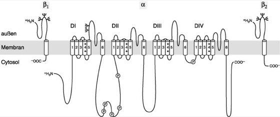 Abb. 2: Theoretische transmembranäre Struktur des spannungsabhängigen Natriumkanals. Der am besten untersuchte Na+-Kanal aus dem Hirn der Ratte ist aus 1 α- und 2 β-Untereinheiten aufgebaut. Auf der dem Extrazellularraum zugewandten Kanalseite befinden sich Glykosylierungsstellen. Die α-Untereinheit besteht aus einem Protein mit 4 homologen Domänen (DI–DIV), die sich ringförmig zusammenlagern und eine Pore bilden. Jede dieser Domänen weist 6 α-helikale transmembranäre Abschnitte (S1–S6) auf. Zielgerichtete Mutagenese von Aminosäuren der α-Untereinheit ermöglicht die Aufklärung der Funktion einzelner Abschnitte. Die teilweise in die Membran zurückkehrenden Schleifen zwischen S5 und 6 (P-[Poren-]Region) bilden den Eingangsbereich der Kanalpore und den Selektivitätsfilter, positiv geladene Aminosäuren (Arginin oder Lysin) in S4 den Spannungssensor (gating charge). Er reagiert auf Änderungen des elektrischen Feldes über der Zellmembran mit einer Konformationsänderung und initiiert so die Kanalöffnung. Die intrazelluläre Schleife zwischen DIII und DIV ist essentiell für die rasche Inaktivierung der Kanäle. Nach Aktivierung verlegt sie die offene Pore und blockiert so den Natriumionenfluß. Der Aufbau der α-Untereinheit ist analog den spannungsabhängigen Calciumkanälen; spannungsabhängige Kaliumkanäle sind ebenfalls sehr ähnlich strukturiert. In Xenopus-Oocyten führt die alleinige Expression der α-Untereinheit zur Bildung funktionsfähiger Na+-Kanäle, deren Aktivierungs- und Inaktivierungskinetik jedoch stark verlangsamt und deren Einzelkanalleitfähigkeit um ca. 60% geringer sind als die normaler Kanäle. Erst eine Co-Expression mit der β1-Untereinheit führt zu einer Kinetik und Einzelkanalamplitude nativer Kanäle. Hierin scheint die Bedeutung der β1-Untereinheit zu liegen. Für die über Disulfidbrücken kovalent gebundene β2-Untereinheit wird eine Rolle bei der Genese sowie bei Transport und Einbau der Na+-Kanäle in die Zellmembran postuliert.