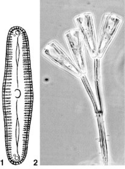 Naviculaceae, Familie der Pennales (Kieselalgen, Unterordnung Biraphidineae); beide Valvae mit echter, symmetrischer Raphe ( Algen II ), schiffchenförmig. Häufige Gattungen: Navicula, ca. 1000 Arten im Süß- und Meerwasser, artenreichste Gattung der Kieselalgen, Raphen gerade, an Enden leicht umgeknickt; häufige Süßwasserarten Navicula oblonga und Navicula cuspidata. Stauroneis, ca. 35 Arten im Süß- und Meerwasser, Valvae schiffchenförmig, Pleuralansicht rechteckig, bilden kurze bandförmige Kolonien. Diploneis, 65 Arten, meist marin, Valvae breit, elliptisch, häufig in der Mitte eingeschnürt. Pinnularia ( vgl. Abb. ), ca. 200 Arten im Süß- und Meerwasser, Valvae lineal-elliptisch mit breiten Rippen. Caloneis, ca. 40 Arten im Süß- und Meerwasser, Valvae mit fein gefiederten Strukturen, durch 1 oder mehr Längslinien gekreuzt. Gyrosigma ("Sigmaalge"; Einzeller II ), ca. 30 Arten im Süß- und Meerwasser, Valvae S-förmig gebogen, Valvarstrukturen kreuzen sich rechtwinklig. Pleurosigma, ca. 40 marine Arten, Valvae S-förmig, Querstrukturen der Valvae von 2 schräglaufenden Streifen gekreuzt; Pleurosigma angulatum, Testobjekt für Mikroskopobjektive. Amphora, ca. 150 meist marine Arten, sichelförmige Valvae liegen geneigt zueinander, konvexe Seite breiter (ähnlich Apfelsinenscheibe). Cymbella, ca. 100 Arten, meist Süßwasserformen, Valvae schiffchenartig, in Längsachse schwach gebogen; in Altwässern und Quellen häufig Cymbella ventricosa, bildet durch Gallertausscheidung gelbbraune, mehrere cm große Kolonien. Gomphonema ( vgl. Abb. ), ca. 100 Arten, meist Süßwasserformen, Valvae keilförmig, Zellen mittels Gallertstiel am Substrat verhaftet; bilden zum Teil dichte Überzüge.