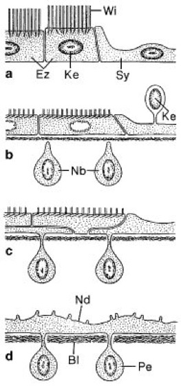 Bl Basallamelle, Ez Epidermiszelle, Ke Kern, Nb Neoblasten, Nd Neodermis, Pe Perikaryon, Sy Syncytium, Wi Wimper