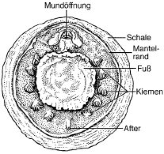 Neopilinaw [von *neo- , Pilina], rezente Gattung der Monoplacophora (Urmützenschnecken) mit napfförmiger Schale ( vgl. Abb. ), die durch 8 Paare dorsoventraler Muskeln mit dem Weichkörper verbunden ist. Neopilina galatheae (37 mm Durchmesser) wurde berühmt als erste lebend entdeckte Art der Klasse, die zahlreiche fossile Formen umfaßt: sie wurde 1952 durch die dänische "Galathea"-Expedition vor der Westküste Mittelamerikas aus 3590 m Tiefe geholt. Inzwischen wurden weitere rezente Arten bekannt, die heute 7 Gattungen (einschließlich Neopilina) zugerechnet werden. Diese unterscheiden sich durch Schalenstruktur, Größe, Anzahl der Kiemenpaare und anatomische Merkmale von Neopilina. Deren Vertreter leben kriechend auf Schlammboden beiderseits des Äquators und der Antarktis in Tiefen von 174–6500 m. Neopilina ernährt sich von Diatomeen, Radiolarien und Foraminiferen. lebende Fossilien .