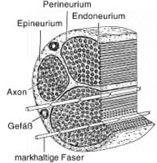 Schematische Darstellung der Enkapsis-Gliederung eines Nervs in Quer- und Längsschnitt