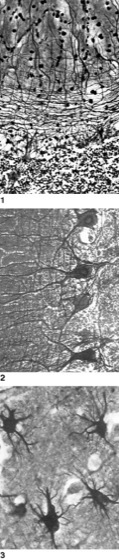 Mikroskopische Aufnahmen 1 eines Ausschnitts aus dem Kleinhirn (deutlich sichtbar die komplexe Verschaltung der verschiedensten Typen von Nervenzellen über ein inniges Geflecht zahlloser Nervenfortsätze), 2 von Neuronen (Purkinje-Zellen) des menschlichen Kleinhirns (mit sichtbaren Zellkörpern und reich verzweigtem Dendritensystem), 3 von Astrocyten