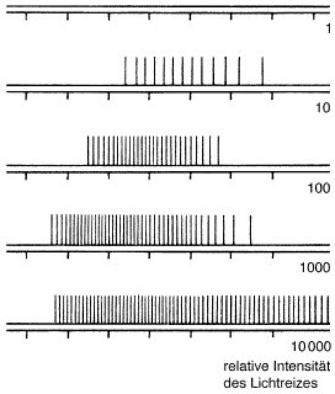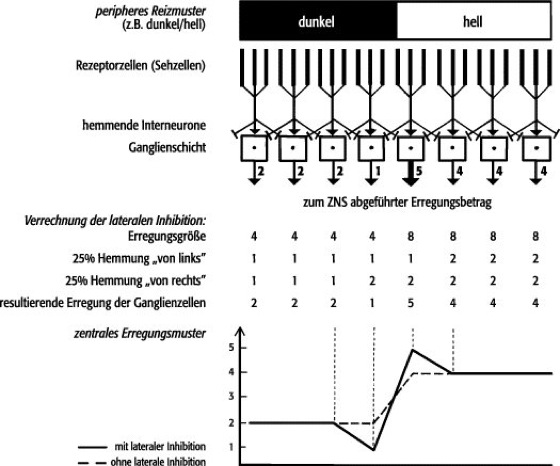 Abb. 5: Schematische Darstellung der lateralen (Vorwärts-)Inhibition. Zur Veranschaulichung des Prinzips wurde die durch diese Hemmung verursachte Kontrastüberhöhung anhand von Zahlenbeispielen dargestellt. Vereinfachend wurde eine Linearität zwischen Reizintensität und Erregungsgröße angenommen. Die von den Rezeptoren kommende Erregung wird an die Ganglienzellen weitergegeben, wobei über Kollaterale gleichzeitig hemmende Interneurone erregt werden. Diese wirken mit einer angenommenen Hemmung von 25% (bezogen auf die Erregungsgröße der Rezeptoren) auf die benachbarten Ganglien ein.