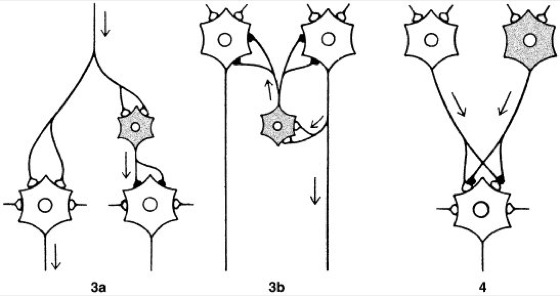 Abb. 3:postsynaptische Hemmungen:a afferente kollaterale Hemmung, b rückläufige (rekurrente) Hemmung.