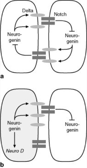 Abb. 8: Spezifizierung von neuronalen Vorläuferzellen bei Xenopus. Zellen in der Neuralplatte synthetisieren zunächst Neurogenin, aber auch die transmembranen Moleküle Delta (als Signal) und Notch (als Rezeptor). Diejenige Zelle in einer Gruppe, die zufällig zuerst mehr Delta produziert, hemmt in benachbarten Zellen über Aktivierung des Notch-Rezeptors die Bildung von Neurogenin und damit die Differenzierung zu Neuronen. In der mehr Delta produzierenden Zelle wird die Neurogenin-Produktion nicht mehr unterdrückt, die Bildung von Neuro D wird aktiviert, und die Zelle wird zur neurogenen Vorläuferzelle.