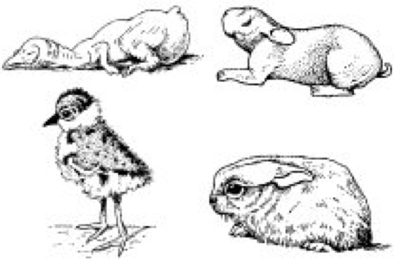 Während bei Vögeln die Zugehörigkeit zu den Jungentypen Nesthocker (hier Wendehals) und Nestflüchter (hier Kibitz) auch der systematischen Zuordnung entspricht, können bei Säugetieren auch nahe Verwandte verschiedenen Typen angehören, wie das zu den Nesthockern zählende Kaninchenjunge und der zu den Nestflüchtern gehörige junge Hase.