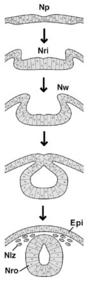 Abb. 1: Entstehung des Neuralrohrs durch Auffaltung und Fusion der Neuralwülste und anschließende Abtrennung des Neuralrohrs von der Epidermis. Epi Epidermis, Nlz Neuralleistenzellen, Np Neuralplatte, Nri Neuralrinne, Nro Neuralrohr, Nw Neuralwulst