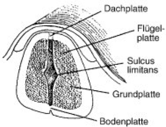 Boden-, Dach-, Flügel- und Grundplatte im embryonalen Rückenmark der Wirbeltiere. Im Neuralrohr des späteren Rückenmarks findet schon früh in der Entwicklung eine dorsoventrale Regionalisierung statt. In der ventralen Hälfte des Neuralrohrs, der Grundplatte, werden von der Chorda und den (nicht-neuralen) Zellen der Bodenplatte (die ihrerseits ebenfalls von der Chorda induziert wurde) über das Signalmolekül Sonic-Hedgehog (shh; sonic-hedgehog) die Bildung von Motoneuronen induziert. Von dorsal induzieren die Dachplatte (Deckplatte) und angrenzende Epidermis über die Signalmoleküle BMP-4 (BMP) und Dorsalin-1 (beides Mitglieder der TGFβ-Familie; TGF) in der Flügelplatte die Bildung von kommissuralen Neuronen, deren Axone die beiden Seiten des Rückenmarks verbinden.