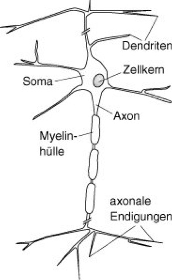 Die Dendriten stellen die Eingangsfasern des Neurons dar. Sie sind mit bis zu 10.000 Kontaktstellen, den Synapsen, besetzt, über die das Neuron Signale von anderen Nervenzellen empfängt. Die Signale breiten sich im Dendritenbaum bis zum Zellkörper (Soma, Perikaryon) aus. Überschreitet durch Depolarisation die Spannung an der Soma-Membran einen Schwellenwert von ca. –40 mV, so wird am Ansatzpunkt der Nervenfaser(Axon) eine pulsförmige elektrische Welle (Aktionspotential, Spike) ausgelöst, die ungedämpft entlang der Nervenfaser zu den axonalen Endigungen läuft: das Neuron feuert. Zur Erhöhung der Signalgeschwindigkeit sind manche Axone von einer isolierenden Proteinschicht, der Myelinscheide (Markscheide), umgeben. An den axonalen Endigungen schließlich wird das elektrische Signal über Synapsen an nachgeschaltete Neurone oder Muskelzellen (Muskeln, Muskulatur) übertragen.