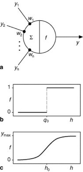 Abb. 4: Neuronenmodelle für Netzwerke mit diskreter Zeitstruktur: a Schematische Darstellung eines Neurons mit Eingaben y1, ..., yn, Synapsenstärken w1, ..., wn und Ausgabe y. Das Symbol Σ steht für die Berechnung der Aktivierung h des Neurons durch Summenbildung, das Symbol f bezeichnet die Ausgabefunktion zur Ermittlung der Neuronenausgabe y. b Ausgabefunktion f für ein McCulloch-Pitts-Neuron; es existieren nur die möglichen Ausgabewerte y = 0 oder y = 1; q0 Schwellenwert. c Ausgabefunktion f für ein Analogneuron, bei dem die Ausgabe y beliebige Werte zwischen y = 0 (kein Feuern) und y = ymax (Feuern mit maximaler Feuerrate) annehmen kann; für h = h0 feuert das Neuron mit der Rate ymax/2.