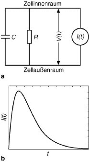 Unterhalb der neuronalen Feuerschwelle läßt sich das Zeitverhalten des Membranpotentials V quantitativ durch eine Differentialgleichung beschreiben, die sich nach J.C. Eccles aus dem in Abb. 5 gezeigten Stromkreis, dem sog. Ersatzschaltbild des Neurons, ergibt. Um die Erzeugung von Aktionspotentialen zu berücksichtigen, wird zusätzlich eine Feuerschwelle angenommen. Überschreitet das Membranpotential zu einer bestimmten Zeit diese Schwelle, so gibt das Neuron einen Spike ab, und das Membranpotential wird anschließend auf Null gesetzt. Für die bei einem Neuron ankommenden Spikes wählt man z.B. einen kurzen, pulsartigen Strom I(t); dieser führt zu einer sprunghaften Änderung des Membranpotentials mit anschließender exponentieller Rückkehr zum Ruhepotential V = 0. Alternativ läßt sich die Form postsynaptischer Potentiale detaillierter durch Verwendung einer anderen Stromfunktion modellieren; hier wird meist die sog. Alpha-Funktion verwendet ( vgl. Abb. 5b ). Refraktärzeiten können zusätzlich durch eine zeitabhängige Feuerschwelle berücksichtigt werden.