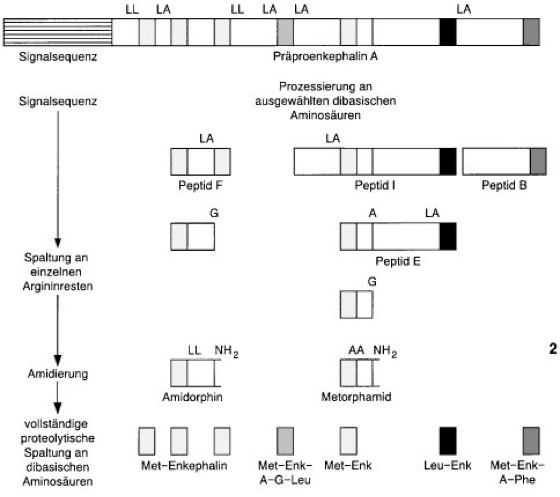 2Prozessierung von Präproenkephalin A (L = Lysin, A = Arginin, G = Glycin). Präproenkephalin A enthält 4 Kopien von Met-Enkephalin, 1 Kopie von Met-Enkephalin-Arg-Gly-Leu und 1 Kopie von Met-Enkephalin-Arg-Phe, jeweils begrenzt durch dibasische Aminosäuren (Arginin, Lysin). Durch proteolytische Prozessierung an spezifischen Orten mit dibasischen Aminosäuren entstehen die Peptide, die im Nebennierenmark gefunden werden (Peptid F, Peptid E, Peptid B und Peptid I). Eine Spaltung an einzelnen Arginin-Resten und anschließende Amidierung führen zu Amidorphin oder Metorphamid. Die vollständige Spaltung an den dibasischen Aminosäuren setzt die Pentapeptid-Enkephaline sowie Met-Enkephalin-Arg-Gly-Leu und Met-Enkephalin-Arg-Phe frei.