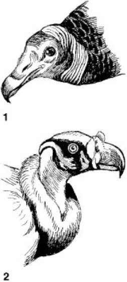 Kopf 1 des Rabengeiers (Coragyps atratus),2 des Königsgeiers (Sarcorhamphus papa)