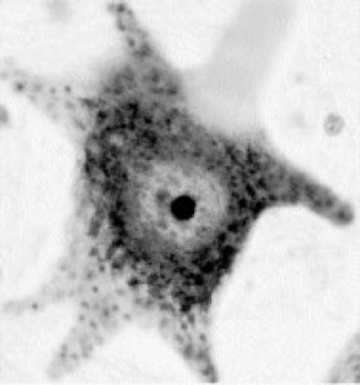 Motoneuron aus dem Vorderhorn des Rückenmarks in Nissl-Färbung; rundum 6 Dendritenabgänge und oben der von Nissl-Schollen freie Ursprungskegel des Axons.