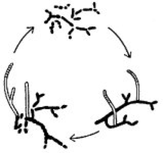 Nocardia-Mycel und Einzelzellen; helle Hyphen = Luftmycel, dunkle Hyphen = Substratmycel