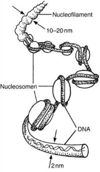 Abb. 1: Molekularer Bau eines Chromatinstrangs (Nucleofilament): kugelförmige Histonkomplexe (Nucleosomen) werden von der DNA-Doppelhelix umgeben.