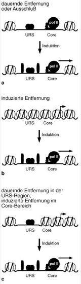 Abb. 2: Jahrelange biochemische und genetische Studien ergaben, daß es eine strenge Korrelation zwischen der Veränderung der Chromatinstruktur, der Modifikation von Histonproteinen und der Transkriptionsaktivität von eukaryotischen Genen gibt. Es gibt bislang mindestens 3 unterschiedliche Strategien, wie eukaryotische Zellen bei der Transkription Nucleosomen entfernen: a dauernde Entfernung oder Ausschluß von Nucleosomen. Dies bedeutet, daß der Promotor ständig nucleosomenfrei, also zugänglich für Transkriptionsfaktoren, ist, wie z.B. bei konstitutiv transkribierten Genen oder beim Hitzeschock-Promotor von Drosophila. b Im Fall der induzierten Entfernung von Nucleosomen ist sowohl die URS-Region (upstream regulatory sequence) als auch der eigentliche Promotorbereich (core) mit Nucleosomen bedeckt. Diese werden direkt oder indirekt vor der Genaktivierung durch regulatorische Faktoren entfernt, wie am Beispiel des Hefepromotors PHO5 (saure Phosphatase) gezeigt werden konnte. Die in diesem Fall positionierten Nucleosomen werden durch die Aktivierung der PHO2- und PHO4-Proteine – unabhängig von der DNA-Polymerase über einen unbekannten Mechanismus – entfernt. Ähnliches ist beim MMTV (mouse mammary tumor virus) und beim Tyrosinaminotransferase-Promotor der Ratte der Fall, die jeweils "Glucocorticoid-response-Elemente" (GRE) besitzen. Bei der Induktion durch Glucocorticoide werden die GRE-Regionen zugänglich für regulatorische Faktoren, indem die Nucleosomen sich ablösen. c Andere Gene benutzen eine Strategie, die aus beiden oben genannten Elementen besteht: dauernde und induzierte Entfernung von Nucleosomen, wie am Beispiel des Galactose-induzierbaren Promotors (GAL1/10) nachgewiesen wurde. Die Region, welche die Bindungsstelle für den induzierenden GAL4-Faktor enthält, ist mit dem konstitutiv bindenden regulatorischen Faktor GRF2 ("general recognition factor") besetzt, der diese Region nucleosomenfrei hält. Der eigentliche Promotorbereich hingegen mit der TATA-Box und der Transkriptionsstartstelle ist mit einem Nucleosom besetzt und zunächst nicht zugänglich. Während der Induktion werden die Nucleosomen entfernt. Die Veränderung der Chromatinstruktur ist nicht eine Folge oder gar eine passive Begleiterscheinung der Genaktivierung, wie lange angenommen wurde, sondern eher eine Voraussetzung dafür.