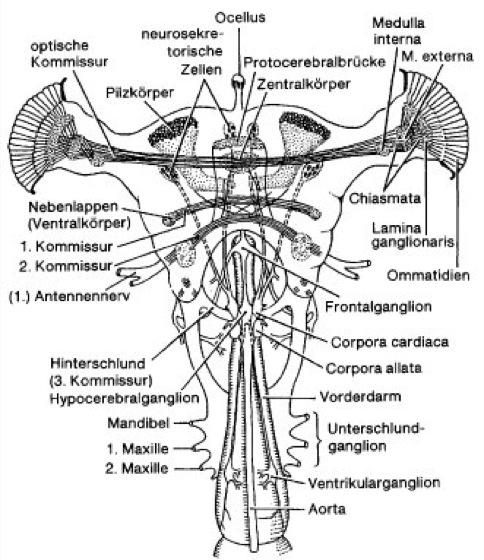 Oberschlundganglions, Supraoesophagealganglion, Cerebralganglion, der über dem Schlund (Pharynx) gelegene Gehirnteil des Zentralnervensystems der Gliedertiere. Bei den Gliederfüßern ( vgl. Abb. ) setzt es sich aus 3 Abschnitten zusammen, dem Protocerebrum, Deutocerebrum und Tritocerebrum. Das Protocerebrum ist Verschmelzungsprodukt des Ganglions des Akrons(Archicerebrum) und des 1. Kopf-Segments (Prosocerebrum). Funktionell bildet es eine völlige Einheit. Es ist das Verarbeitungszentrum aller höheren Sinnesfunktionen sowie das entscheidende Steuerzentrum der meisten komplexeren Verhaltensweisen. Es innerviert die Komplexaugen und hat im Lobus opticus 3 Verschaltungszentren (bei Höheren Krebstieren [Malacostraca] 4): von außen nach innen die Lamina ganglionaris (Periopticon, Ganglienplatte), Medulla externa (Epiopticon, äußeres Marklager) und Medulla interna (Lobula, Opticon, inneres Marklager). Rechter und linker Lobus opticus sind über die Augenkommissur verbunden. Die 3 (oder selten 4) Stirnaugen (Ocellen, Naupliusaugen, Medianaugen; Einzelaugen) werden von einem median gelegenen Ocellarganglion innerviert. Bei Höheren Insekten ist dieses nicht deutlich abgegrenzt. Weitere Verschaltungszentren im Protocerebrum sind die Pilzkörper (Corpora pedunculata), die in Abhängigkeit von der Größe der Komplexaugen und der "Intelligenz" sehr verschieden groß sein können. Histologisch haben sie oft eine Pilzform (Name!). Ein Pilzkörper besteht aus einem oder mehreren Stielen (Pedunculus), die zum sog. Balken umbiegen. An der Spitze ist eine becherförmige Fasermasse (Becher, Calix) ausgebildet. Zwischen den beiden Pilzkörpern befinden sich die unpaare Protocerebralbrücke (Pons protocerebralis) und der Zentralkörper (Corpus centrale) als weitere Glomeruli (Verschaltungszentren). Unter den Pilzkörpern liegen paarig kleinere Zentren, die Ventralkörper, die über die Protocerebralkommissur verbunden sind. Diese ist die 1. Kommissur, d.h. diejenige zwischen den beiden Ganglien des 1. Segments des Kopfes (Prosocephalon). Über die genaueren Funktionen all dieser Zentren ist man bis heute nur wenig unterrichtet. – Das Deutocerebrum, das dem Protocerebrum eng angegliedert ist (primäres Syncerebrum), ist das Verschaltungszentrum für die 1. Antennen. Zwischen den beiden mächtigen Glomeruli verläuft die 2. Kommissur. – Das Tritocerebrum innerviert bei Krebstieren die 2. Antennen, bei Spinnentieren die Cheliceren. Bei den Monantennata (Tracheata) fehlt die zu innervierende Extremität (= 2. Antenne). Bei Insekten ist es der Ursprungsort für die Frontalkonnektive – Nerven, die den Labrumnerv abzweigen und die Verbindung mit dem Frontalganglion herstellen. Letzteres kleine Ganglion liegt vor dem Oberschlundganglion und ist das übergeordnete Zentrum des stomatogastrischen Nervensystems. Das Tritocerebrum vereinigt sich ontogenetisch erst mit dem primären Syncerebrum, wenn das Stomodaeum (Vorderdarm; Mundbucht) bereits eingestülpt ist. Dementsprechend bleibt seine Tritocerebralkommissur (= 3. Kommissur) hinter dem Pharynx, den sie daher ventral als Schlinge umfaßt. Die vom Tritocerebrum abgehenden Konnektive stellen die Verbindung zum Unterschlundganglion dar. Cerebralganglion, Gehirn (Abb.), Nervensystem, Schlundring; üß Gliederfüßer I .