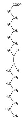 Ölsäure, Octadecensäure, veraltete Bezeichnung Oleinsäure, C17H33COOH, die in der Natur am weitesten verbreitete, aufgrund einer cis-Doppelbindung zwischen den C-Atomen 9 und 10 einfach ungesättigte Fettsäure ( Öä vgl. Abb. ); in reiner Form eine ölige, farb- und geruchlose Flüssigkeit. Ölsäure kommt meist nicht frei, sondern gebunden in Form von Glyceriden, d.h. als Bestandteil von Fetten, fetten Ölen und Phosphatiden, vor. Das trans-Isomere der Ölsäure ist die Elaidinsäure. Chevreul (M.E.), Membran, Olivenöl.