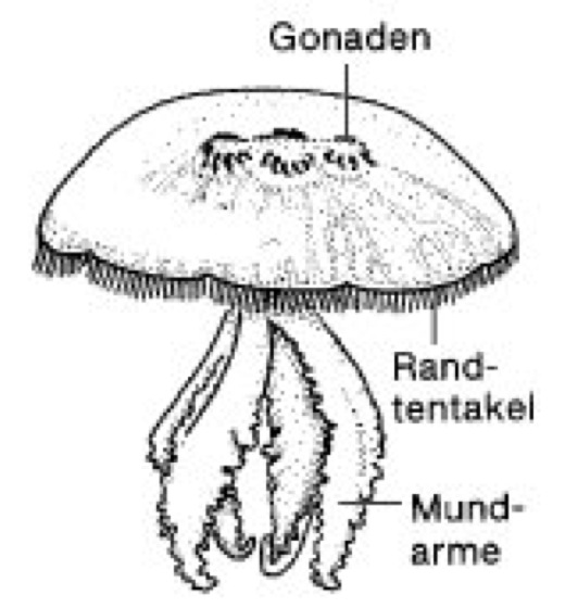 Ohrenqualle, Aurelia aurita, häufiger Vertreter der Fahnenquallen, weltweit in allen Meeren verbreitet; neigt zu Schwarmbildung und starken Bestandsschwankungen. Ohrenquallen erreichen 25–40 cm Durchmesser und haben einen flachen, durchsichtigen Schirm ( vgl. Abb. ). Im Randbereich sind Sinnesorgane (Augen und Statolithen) ausgebildet. Die vielen Randtentakel sind kurz, die 4 Mundarme kräftig und bläulich oder gelblich gefärbt. Die Gonaden fallen als hufeisenförmige, kompakte, oft violett gefärbte Gebilde in der Schirmgallerte auf. Die Nesselkapseln (Cniden) der Ohrenquallen sind sehr schwach und zeigen auf der menschlichen Haut keine Wirkung. Die Nahrung besteht zum großen Teil aus Plankton (vom Einzeller bis zur Fischlarve), das von den Wimpern der gesamten Oberfläche zum Schirmrand gebracht wird. Von dort holen es die Mundarme ab. Neben Plankton wird auch größere Beute verzehrt (z.B. Borstenwürmer, kleine Fische). Anfang des 20. Jahrhunderts konnte an der Westküste Schottlands die Entwicklung der Ohrenqualle im Detail erforscht werden: geschlechtsreife Medusen im Frühsommer, Ende Juni: freie Planulae (0,2 mm groß) zwischen den Mundarmen, Anfang August: Polypen auf Laminaria, November–Januar: Strobilation (Bildung von Ephyra-Larven), Februar: Polypen verschwinden, Ephyren und kleine Medusen im Plankton, April: Medusen-Durchmesser 20 cm, Sommeranfang: Gonadenreifung, Abgabe von Spermaschnüren in das Wasser, die von weiblichen Medusen aufgenommen werden, Tod der Quallen im Spätsommer. Die Faktoren, welche die Strobilation auslösen, sind bis heute unbekannt. Hohltiere IIHohltiere III , Nesseltiere II .