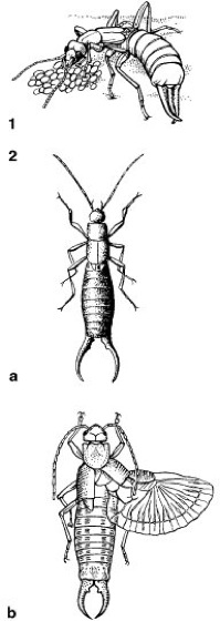 1 Weibchen des Sandohrwurms (Labidura riparia) beim Betreuen seiner Eier; 2 Gemeiner Ohrwurm (Forficula auricularia),a mit zusammengefalteten Flügeln, b Männchen, rechte Flügelseite ausgebreitet