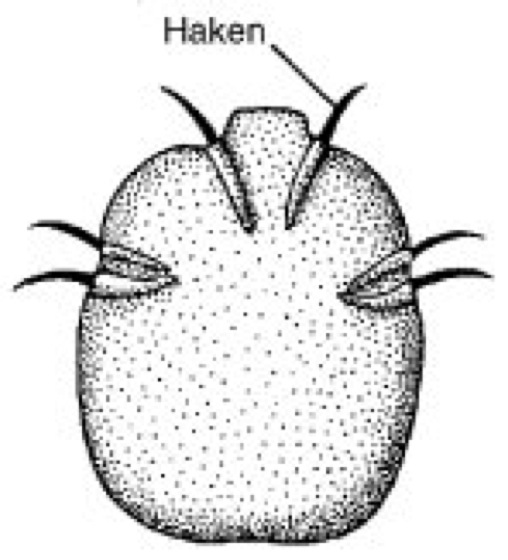 Oncosphaeraw [von griech. ogkos = Haken, sphaira = Kugel], Sechshakenlarve, Hexacanthus, durch 6 Haken gekennzeichnetes, intrauterin in der Eischale sich entwickelndes, nicht freischwimmendes 1. Larvenstadium der Bandwürmer ( vgl. Abb. ). Coracidium, Procercoid.