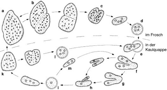 a, b trophische Zelle im Enddarm des Frosches, Zweiteilung; c Teilungsprodukte bilden Cysten; d Cyste, gelangt ins Wasser, muß von Kaulquappe gefressen werden; e, f im Darm der Kaulquappe schlüpft eine Zelle, die Zweiteilungen durchführt; g es werden einkernige Anisogameten gebildet, die paarweise zu Zygoten verschmelzen; i Zygote, encystiert; Zygote gelangt ins Wasser und muß von einer 2. Kaulquappe gefressen werden; je nach Alter dieser Kaulquappe entwickelt sich die aus der Cyste schlüpfende Zelle zu einer normalen trophischen Zelle, welche die Metamorphose zum Frosch mitmacht (i, k, a), zu neuen asexuell entstehenden Cysten (i, k, l) oder zu einem Gamonten (i, m).