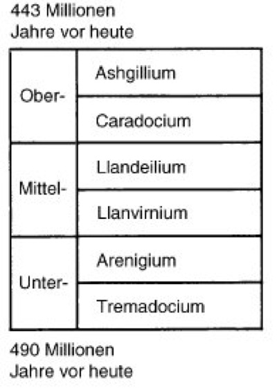 Ordoviziums [benannt nach dem kelt. Stamm der Ordovices in Nord-Wales und Powisland], (Ch. Lapworth 1879), ordovizisches System, 2. Periode des Paläozoikums ( Erdgeschichte IErdgeschichte II ) von ca. 47 Millionen Jahren Dauer; Gesteinsfolge von A. Sedgwick (1833) in Wales und Welsh Borderland erstmals beschrieben (Typus-Gebiet) und als Einheit dem Kambrium zugeordnet; 1835 von Murchison als Unter-Silur eingestuft. Als jüngstes stratigraphisches System erst am 22.8.1960 offiziell anerkannt. Klassische Gebiete des Ordoviziums in Europa sind die Britischen Inseln, die Ostseeländer (Oslo-Gebiet, Südschweden, Estland) und Böhmen. Gliederung: Die Einteilung in Serien ( vgl. Abb. ) geht zurück auf Sedgwick, Murchison, McCoy, Hicks und Marr; Zonengliederung mit Graptolithen (Zone 1–15) nach Elles und Wood (1901–1918). – Grenzen: Derzeit bildet die Basis des Tremadocium mit dem Einsetzen des Graptolithen Dictyonema die Untergrenze; das Ordovizium endet beim ersten Auftreten des Graptolithen Glyptograptus persculptus der Zone 16. Leitfossilien: vorwiegend Graptolithen, Conodonten, Trilobiten, untergeordnet Brachiopoden, Stachelhäuter, Nautiloidea, Chitinozoa und Spurenfossilien (Phycoden). Gesteine: Schiefer, Kalke, Sandsteine, Grauwacken, Quarzite, überwiegend basische Vulkanite, Granite und Eisenerze (Gesteine). Paläogeographie: Während auf der Süd-Halbkugel wahrscheinlich weiterhin die geschlossene Landmasse aus dem Kambrium (Gondwanaland) fortdauerte (Kontinentaldrifttheorie), hatte sich nunmehr auch im Norden ein weitgehend geschlossener Kontinent (Laurasia) formiert; ein tiefer Ozean trennte beide Landmassen. Der Nordamerika von Europa scheidende Uratlantik (Iapetus, kaledonische Geosynklinale) begann sich im Zuge der kaledonischen Orogenese zu verengen. Weite Gebiete im Westen der osteuropäischen Plattform und Mitteleuropas zwischen Baltischem Schild im Norden und Alemannischem Land im Süden, die im Ober-Kambrium trocken gefallen waren, wurden erneut vom Meer bedeckt. Das Ordovizium war eine Zeit lebhafter Krustenbewegungen. In den Geosynklinalen setzte die kaledonische Gebirgsbildung ein. Sie bewirkte die Entstehung vulkanischer Inselbögen (Vulkanismus) und den reichen Wechsel der Gesteins-Fazies. Ihren Höhepunkt erreichte die Transgression im Caradocium. Gegen Ende des Ordoviziums löste die altkaledonische (= taconische) Faltung umfassende Regressionen aus. Klima: Das Ordovizium war eine Zeit klimatischer Gegensätze. Kalksteine und Evaporite weisen für den Anfang warmes Klima aus. Im Ashgillium herrschten im Bereich des damaligen Südpols (in Nordwest-Afrika) eiszeitliche Bedingungen mit einer geschlossenen Eiskappe. Die Region des Paläoäquators erstreckte sich vom Rand der Antarktis über die Sibirische Plattform und nordamerikanische Arktis (Polarregion) zum Nordwest-Rand Nordamerikas. Dieser tropische Gürtel brachte zahlreiche neue Gruppen von Wirbellosen, insbesondere Kalkschaler, hervor. – Zur Flora und Fauna des Ordoviziums: vgl. Infobox . Erdgeschichte (Tab.).