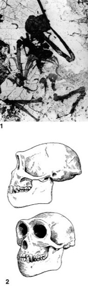 Das 1958 in einer toskanischen Braunkohlegrube entdeckte, erst an einer Seite freipräparierte Skelett; erkennbar die abgespreizten Oberschenkelknochen, die Rippen und die angelegten Arme. 2 Schädel von der linken Seite (oben) und von links vorne (unten) nach einem ersten Rekonstruktionsversuch von J. Hürzeler. Hürzeler hielt Oreopithecus für einen Vorfahren des Menschen und rekonstruierte einen Schädel mit großem Gehirn. In neueren Rekonstruktionen wird der Schädel mehr affenartig mit kleinem Gehirn dargestellt.