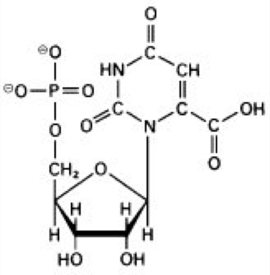 Orotidin-5'-phosphats, Orotidin-5'-monophosphat, Orotidylsäure, Abk. OMP, Zwischenstufe bei der Synthese der Pyrimidinnucleotide; dabei bildet sich Orotidin-5'-phosphat ( vgl. Abb. ) aus Orotsäure und 5-Phosphoribosyl-1-pyrophosphat. Die Weiterreaktion zu Uridin-5'-phosphat (Uridinmonophosphat) erfolgt durch CO2-Abspaltung.