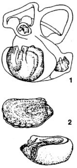 1 Die geschwärzten Zonen der flüssigkeitserfüllten Ausweitungen des Innenohrs (stark vergrößert) des Umberfisches Aplodinotus deuten die Lage der Otolithen an. 2 Zwei Ansichten eines Otolithen aus dem unteren Eozän; sie gehören zum Grätenfisch Albula und sind in etwa natürlicher Größe abgebildet.