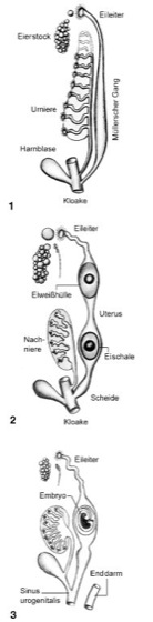 Eileiter im Urogenitalsystem bei 1 Amphibien, 2 Reptilien und Vögeln, 3 Säugern