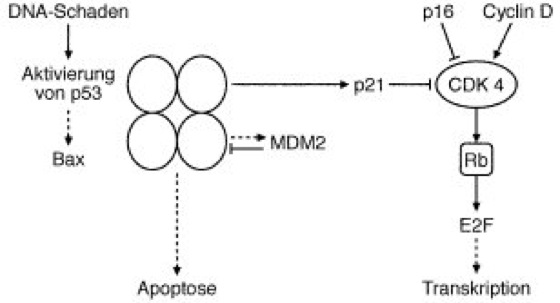 Abb. 2: Wirkung von p53: Durch die Beschädigung der DNA wird p53 aktiviert. Je nachdem, in welcher Phase des Zellzyklus die Aktivierung auftritt, löst p53 die Apoptose oder, über eine Aktivierung des Inhibitors p21, die Unterbrechung des Zellzyklus zur Reparatur des DNA-Schadens aus. Rb ist der Hauptregulator des Zellzyklus und bindet den Transkriptionsfaktor E2F. Die Phosphorylierung von Rb durch Cyclin/CDK4 führt zur Freisetzung und Aktivierung von E2F. p16 stellt einen weiteren Inhibitor der Cyclin-abhängigen Kinase dar; Bax ist ein proapoptotisch wirkendes Protein, das durch p53 induziert wird, wenn irreparable DNA-Schäden auftreten.
