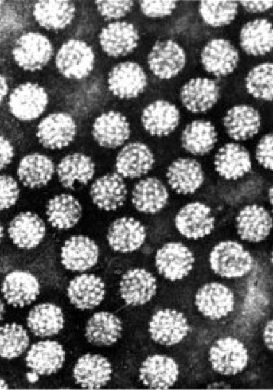 Abb. 1: HPV-Viruspartikel im elektronenmikroskopischen Bild. Deutlich zu erkennen (als "Körnelung") sind die Bausteine (Capsomeren) der Capside.