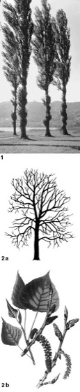 1 Pappeln (Populus spec.);2 Schwarz-Pappel (Populus nigra),a Wuchsform, b links ♂, rechts ♀ Blütenzweig, dahinter der Blattzweig