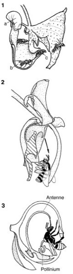 1Coryanthes: der Weg des Bestäubers führt vom Ort der Duftproduktion (a) in den Wasserbehälter (b) zum Ausgang (c), wo sich die Pollinien bzw. die Narbe befinden. 2Stanhopea: beim Verlassen der Blüte bleiben die Pollinien am Bestäuber hängen bzw. werden die Pollinien in die Narbe abgegeben. 3Catasetum: in der staminaten Blüte wird bei Berührung der Antenne ein Schleudermechanismus ausgelöst und das Pollinium auf der Biene festgeklebt.