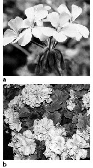 Scharlach-Pelargonie (Pelargonium-zonale-Hybrid), "Geranien"-Sorte; b Edelpelargonie (Pelargonium-grandiflorum-Hybrid)