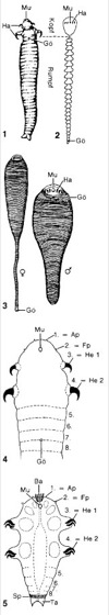 1Raillietiella (♀, ca. 1 cm lang); 2Cubirea (♀, ca. 10 cm lang); 3Linguatula (♂ je nach Art 2 mm bis 2 cm lang; ♀ bis über 10 cm lang); 4 Vorderende (schematisch); 5 Erstlarve (schematisch): gestrichelt = Darm, punktiert = 4 Paar Coelombläschen (tatsächlich nur embryonal).
