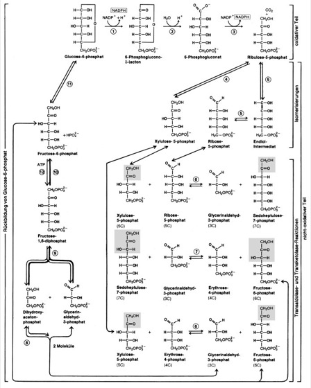 1 Glucose-6-phosphat-Dehydrogenase, 2 Lactonase, 3 6-Phosphogluconat-Dehydrogenase, 4 Phosphopentose-Isomerase, 5 Phosphopentose-Epimerase, 6 Transketolase, 7 Transaldolase, 8 Triosephosphat-Isomerase, 9 Fructose-1,6-diphosphat-Aldolase (Fructose-1,6-bisphosphat-Aldolase), 10 Fructose-1,6-diphosphatase (Fructose-1,6-bisphosphatase), 11 Phosphogluco-Isomerase, 12 Phosphofructokinase.