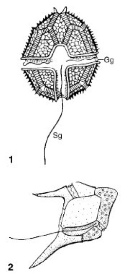 1Peridinium tabulatum mit Schlepp- (Sg) und Gürtelgeißel (Gg); 2Ceratium hirundinella (nach der Teilung)