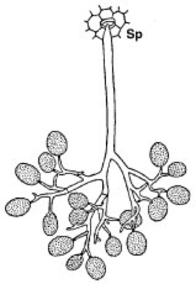 Konidienträger und Konidien von Peronospora ranunculi; Sp = Spaltöffnung des Wirts