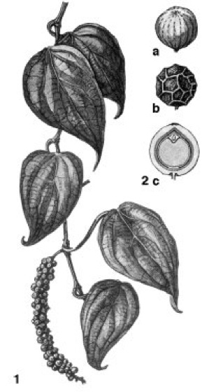 Pfeffer (Piper):1 Zweig mit Fruchtstand, 2 Pfefferkörner, a geschältes, b ungeschältes, c durchgeschnittenes Korn