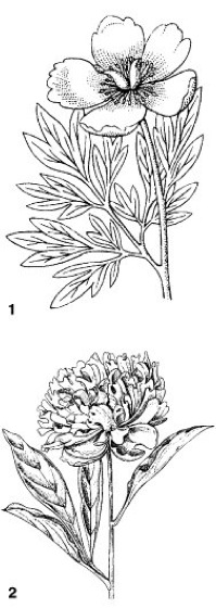 1 Echte Pfingstrose (Paeonia officinalis),2 Edelpäonie, Chinesische Päonie (Paeonia lactiflora) mit gefüllten Blüten