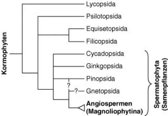 Abb. 1 (KORMOPHYTEN): Vereinfachter Stammbaum der heute noch vertretenen Gruppen der Kormophyten. Als erste heute noch vorkommende Kormophytengruppe haben sich die Bärlappe(Lycopsida) abgespalten. Die Bärlappe sind eine gut abgesicherte monophyletische Gruppe. Dies gilt auch für die Gabelfarne (Psilotopsida; OrdnungPsilotales), die Samenpflanzen(Spermatophyta) und die zu den Schachtelhalmen(Equisetopsida) und echten Farnen(Filicopsida) führende Entwicklungslinie. Das Schwestergruppenverhältnis (Schwestergruppe) von Schachtelhalmen und echten Farnen konnte erst Ende der 1990er Jahre durch molekularsystematische Untersuchungen nachgewiesen werden. Bärlappe, Gabelfarne, Schachtelhalme und echte Farne wurden früher aufgrund plesiomorpher Merkmale (Plesiomorphie) in der polyphyletischen Gruppe der Pteridophyta, d.h. der Farne im weiteren Sinne (Farnpflanzen), zusammengefaßt. Während es sehr gut abgesichert ist, daß es sich bei den verschiedenen Entwicklungslinien der Samenpflanzen (Spermatophyta) um Monophyla (Monophylum) handelt, ist der genaue phylogenetische Zusammenhang der Cycadeenartigen (Cycadopsida), der Ginkgoartigen (Ginkgopsida, Ginkgoatae; Ordnung Ginkgoales), der Coniferen (Pinopsida, Pinatae;Nadelhölzer), der Gnetopsida (Gnetatae) und der Bedecktsamer (Angiospermen, Magnoliophytina) noch nicht endgültig abgesichert. Es mehren sich allerdings die Hinweise, daß die Ginkgopsida und die Pinopsida nahe mit einander verwandt sind, was aufgrund morphologischer Merkmale schon lange postuliert wurde. Die Stellung der Gnetopsida ist umstritten. Sie wurden lange Zeit als Schwestergruppe der Angiospermen angesehen. Neuere molekularsystematische Analysen, basierend auf Sequenzvergleichen mehrerer Gene, machen jedoch eine nahe Verwandtschaft mit den Pinopsida wahrscheinlich (verändert und vereinfacht nach Judd, Campbell, Kellogg & Stevens 1999, Soltis et al. 2000 und Speck 1992).