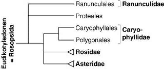 Abb. 2d (Angiospermen, ASTERIDAE): Innerhalb der Unterklasse Asteridae stellen die Hartriegelartigen(Cornales) und die Heidekrautartigen(Ericales) die beiden basalen Entwicklungslinien dar. Sie sind wie auch die Euasteridae I und die Euasteridae II gut abgesicherte monophyletische Gruppen. Zu den Euasteridae I zählen neben den Garryales (Garryaceae) und den Enzianartigen(Gentianales) auch die früher in der Unterklasse Lamiidae zusammengefaßten Nachtschattenartigen(Solanales) und die Lippenblütlerartigen(Lamiales), zu denen u.a. die Lippenblütler(Lamiaceae) und Rachenblütler (Braunwurzgewächse, Scrophulariaceae) gehören. Zu den Euasteridae II zählen neben den Apiales (Umbellales; u.a. mit den Doldenblütlern [Apiaceae]) die Kardenartigen(Dipsacales) und die Korbblütlerartigen(Asterales), mit den Korbblütlern(Asteraceae) und den Glockenblumengewächsen(Campanulaceae) (verändert und vereinfacht nach Judd, Campbell, Kellogg & Stevens 1999 und Soltis et al. 2000).