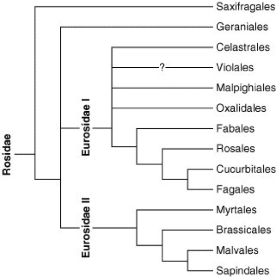 Abb. 2c (Angiospermen, ROSIDAE): Innerhalb der Unterklasse Rosidae (Rosenartige i.w.S.) bilden die Steinbrechartigen(Saxifragales) und die Storchschnabelartigen(Geraniales) die beiden basalen Entwicklungsäste. Sie sind wie auch die beiden großen Entwicklungsäste der Eurosidae I und der Eurosidae II gut abgesicherte Monophyla. In den Eurosidae I findet sich neben den Spindelbaumartigen(Celastrales), den Veilchenartigen(Violales), den Malpighiales (Malpighiaceae) und den Sauerkleeartigen (Oxalidales;Sauerkleegewächse) eine vermutlich monophyletische Entwicklungslinie, welche die wichtigen Ordnungen Hülsenfrüchtler(Fabales),Rosenartige i.e.S. (Rosales),Kürbisartige(Cucurbitales) und Buchenartige(Fagales) beinhaltet. In den Eurosidae II werden die Myrtenartigen(Myrtales), die Brassicales (mit den Kreuzblütlern [Brassicaceae]), die Malvenartigen(Malvales) und die Seifenbaumartigen(Sapindales) zusammengefaßt (verändert und vereinfacht nach Judd, Campbell, Kellogg & Stevens 1999 und Soltis et al. 2000).