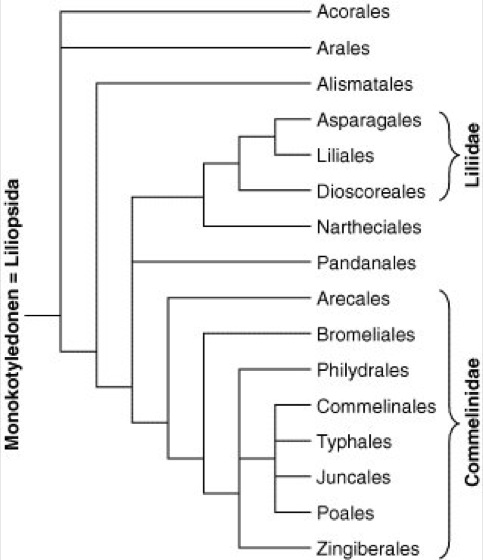 Abb. 2e (Angiospermen, LILIOPSIDA): An der Basis der monophyletischen Liliopsida (Monokotyledonen, Einkeimblättrige Pflanzen) stehen die Kalmusartigen(Acorales). Die zweite basale Entwicklungslinie der Aronstabartigen(Arales) wird von manchen Autoren mit den Froschlöffelartigen(Alismatales) zur Unterklasse Alismatidae zusammengefaßt. Ein großer, mit hoher Wahrscheinlichkeit monophyletischer Entwicklungsast beinhaltet neben den Schraubenbaumartigen(Pandanales) und den Nartheciales die beiden wichtigsten Unterklassen der Monokotyledonen, die Liliidae und die Commelinidae. Zu den Liliidae werden neben den Yamsartigen(Dioscoreales) die beiden großen Ordnungen Lilienartige(Liliales) und Spargelartige(Asparagales) gestellt. An der Basis der Commelinidae stehen die Palmenartigen(Arecales). Weitere wichtige Gruppen der Commelinidae, deren genauer phylogenetischer Zusammenhang jedoch noch nicht endgültig geklärt ist, sind die Ananasartigen(Bromeliales) und die Ingwerartigen oder Blumenrohrartigen(Zingiberales), die Philydrales, die Commelinales, die Rohrkolbenartigen(Typhales) sowie die Binsenartigen(Juncales) mit den Binsengewächsen (Juncaceae) und Sauergräsern(Cyperaceae) und die Süßgräser(Poales, Graminales). Nach heutigem Kenntnisstand erscheint ein naher verwandtschaftlicher Zusammenhang zwischen Juncales und Poales sehr wahrscheinlich (verändert und vereinfacht nach Judd, Campbell, Kellogg & Stevens 1999).