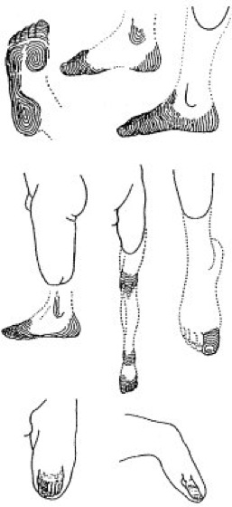Phantomglieder der linken bzw. rechten Unterextremität nach den Schilderungen verschiedener Patienten. Die lebhaft und meist stark emotional empfundenen amputierten Teile sind durch Schraffierung markiert, die „Phantom-Verbindung“ zum Stumpf durch punktierte Linien. Einige Phantomglieder werden in den Stumpf projiziert (unten links und rechts).